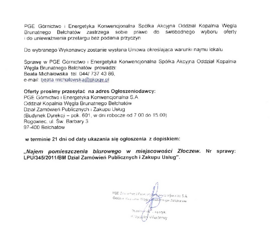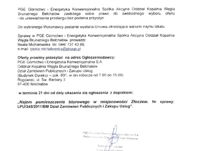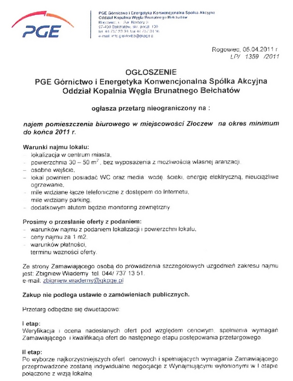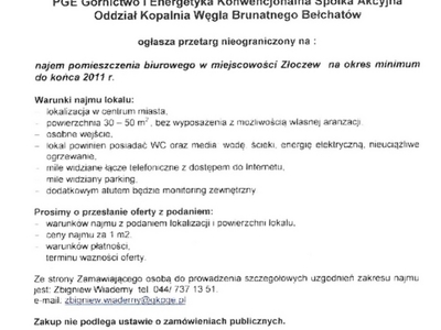 PGE ogłasza przetarg nieograniczony na najem pomieszczenia biurowego w Złoczewie.