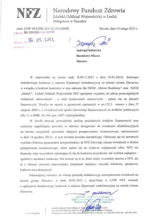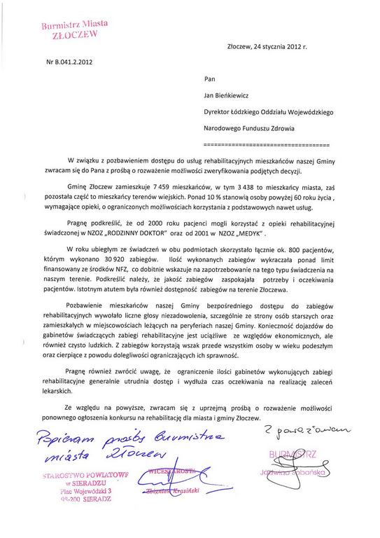 Informacja Burmistrza Złoczewa w sprawie braku opieki rehabilitacyjnej dla mieszkańców.