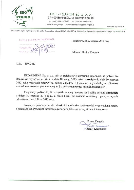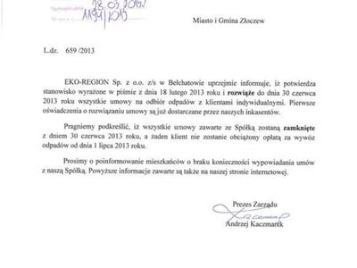 Informacja w sprawie rozwiązania umów na odbiór śmieci.