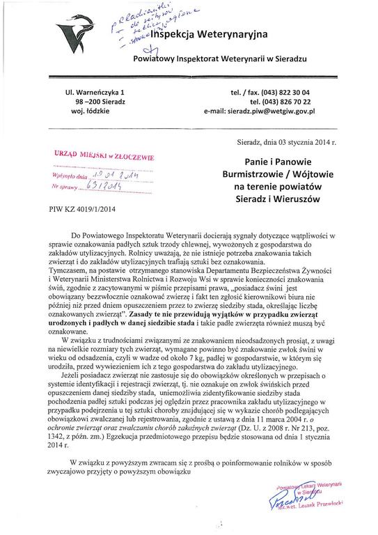 Komunikat Powiatowego Inspektora Weterynarii w Sieradzu.