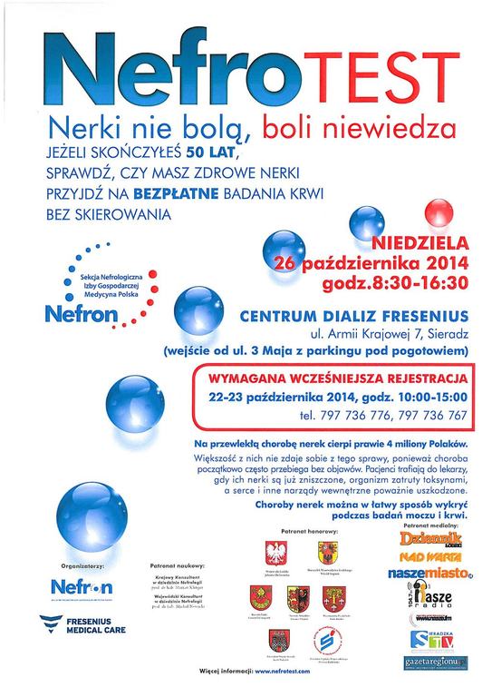 Osoby, które ukończyły 50 lat, będą miały okazję za darmo zbadać swoją krew pod kątem chorób nerek. W niedzielę, 26 października 2014 roku odbędzie się akcja NEFROTEST