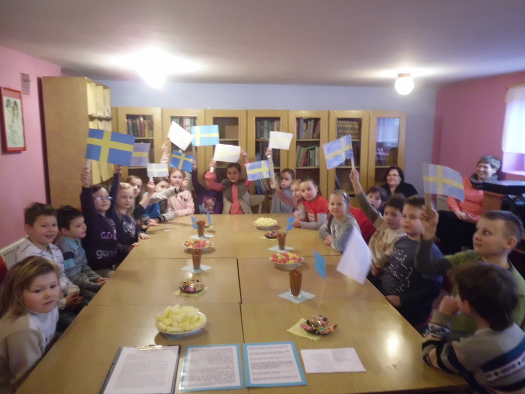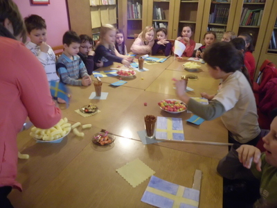 w miłej atmosferze, dzieci uważnie słuchały opowieści o życiu pisarki i poznały niektórych bohaterów książek. W nagrodę za aktywne uczestnictwo uczniowie częstowali się smakołykami ze szwedzkiego stołu. Nie zabrakło też muzyki i pląsów przy piosenkach słynnego zespołu ABBA, oczy wiś-cie ze Szwecji.