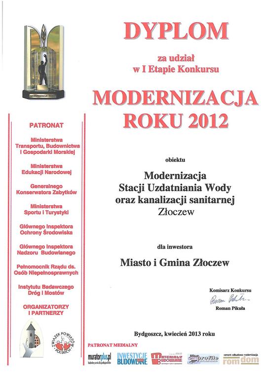 Miło nam poinformować, że Modernizacja Stacji Uzdatniania Wody w Złoczewie została zgłoszona do XVII Edycji Konkursu Ogólnopolskiego "Modernizacja Roku 2012" organizowanego pod patronatem MINISTERSTWA TRANSPORTU, BUDOWNICTWA I GOSPODARKI MORSKIEJ, MINISTERSTWA EDUKACJI NARODOWEJ, MINISTERSTWA SPORTU I TURYSTYKI, GENERALNEGO KONSERWATORA ZABYTKÓW, GŁÓWNEGO INSPEKTORA OCHRONY ŚRODOWISKA, GŁÓWNEGO INSPEKTORA NADZORU BUDOWALNEGO INSTYTUTU BADAWCZEGO DRÓG I MOSTÓW ORAZ ZWIĄZKU POWIATÓW POLSKICH